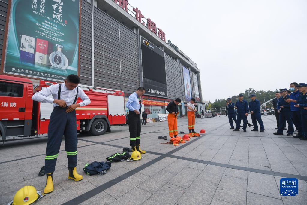 11月2日,工作人员参加消防技能比赛中的“原地着装”环节。