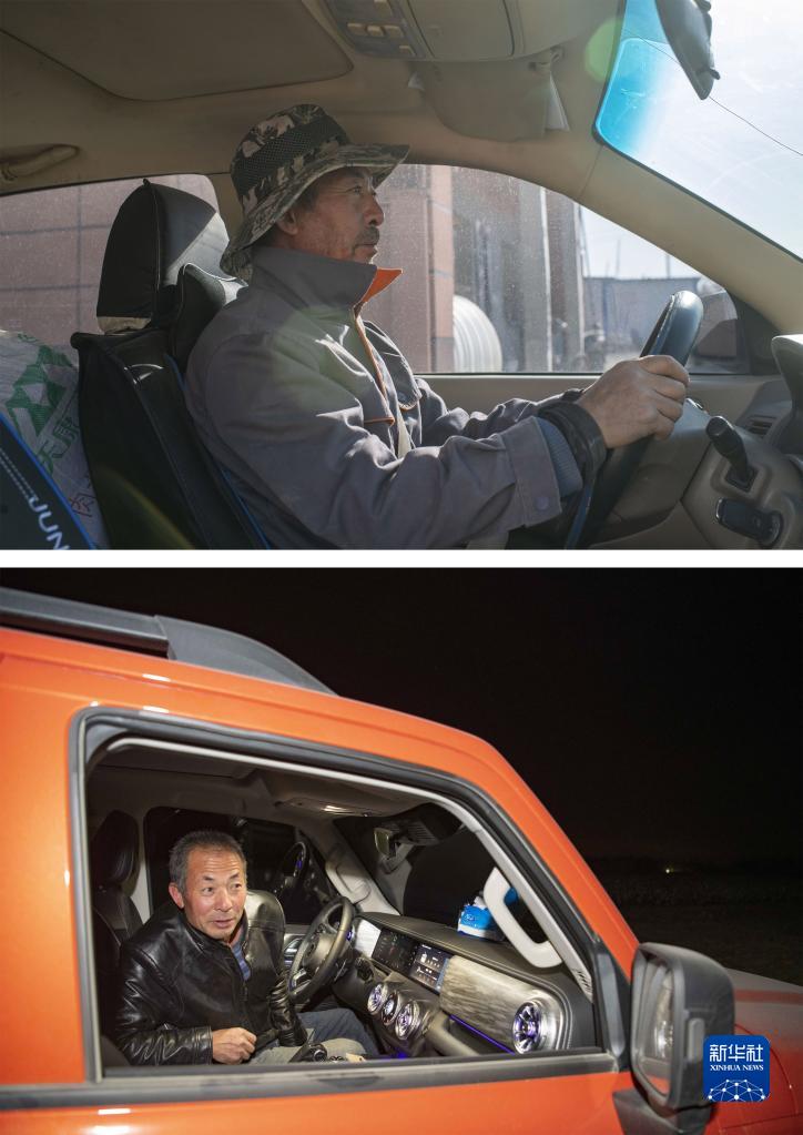 拼版照片:上图为春播时节,陆高林开车载着农资去棉田干活(4月15日摄);下图为秋收时节,陆高林在新换的越野车内等候采棉机转场(10月22日摄)。新华社记者 胡虎虎 摄