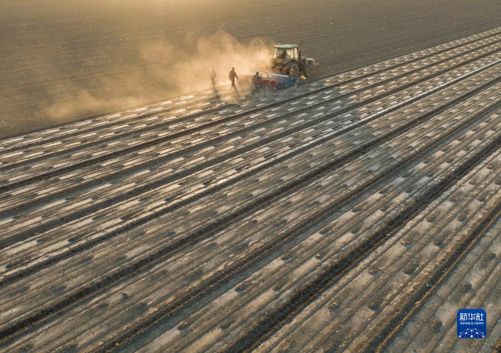 在新疆塔城地区沙湾市大泉乡三道沟村,春播时节,陆高林父子和雇来的工人一起操作机械在棉田里播种(4月15日摄,无人机照片)。新华社记者 胡虎虎 摄