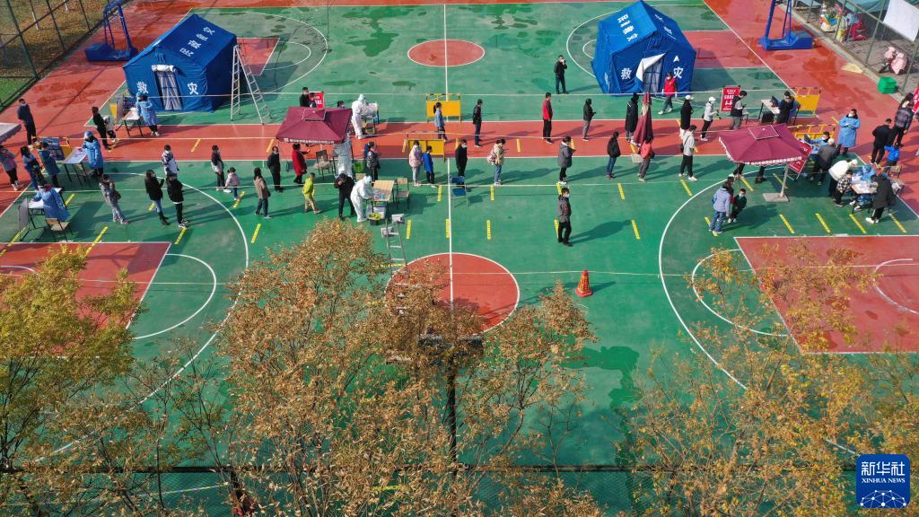 11月2日,市民在宁夏银川市兴庆区丽景湖公园核酸采样点进行核酸采样(无人机照片)。