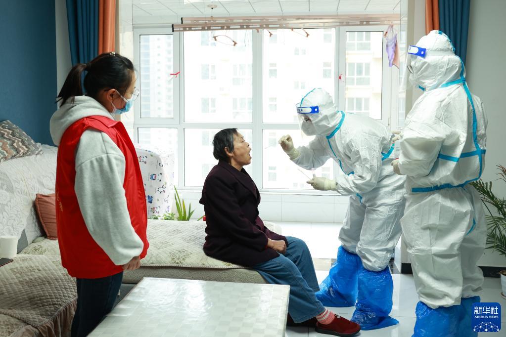 11月2日,在河北省辛集市一小区,医务人员入户为行动不便的居民进行核酸检测。