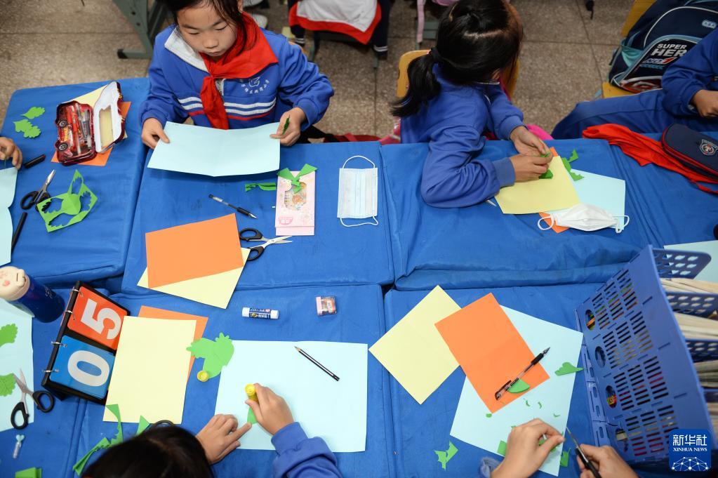11月1日,长沙市砂子塘东澜湾小学的学生在学习剪纸。