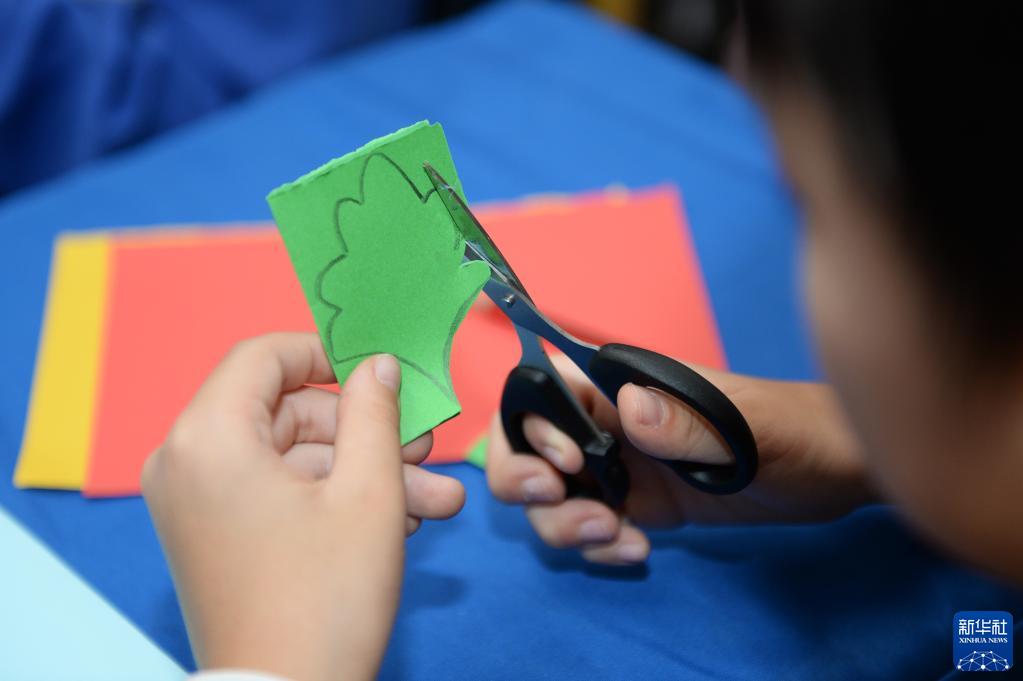 11月1日,长沙市砂子塘东澜湾小学的学生在学习剪纸。