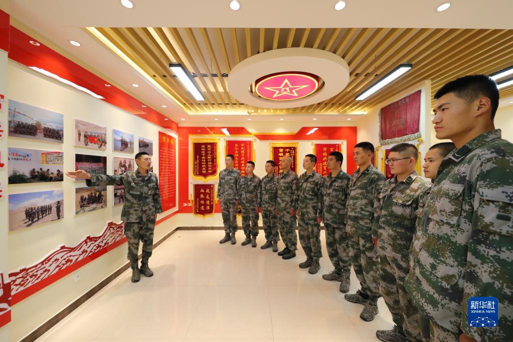联勤保障部队汽车运输某团一营一连连长孟凡龙(左一)为新兵讲述连队历史(7月11日摄)。