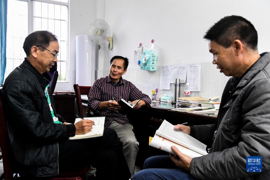 11月2日,在巷口村巷口小学,许思红(中)在放学后与两位老师讨论教学内容。