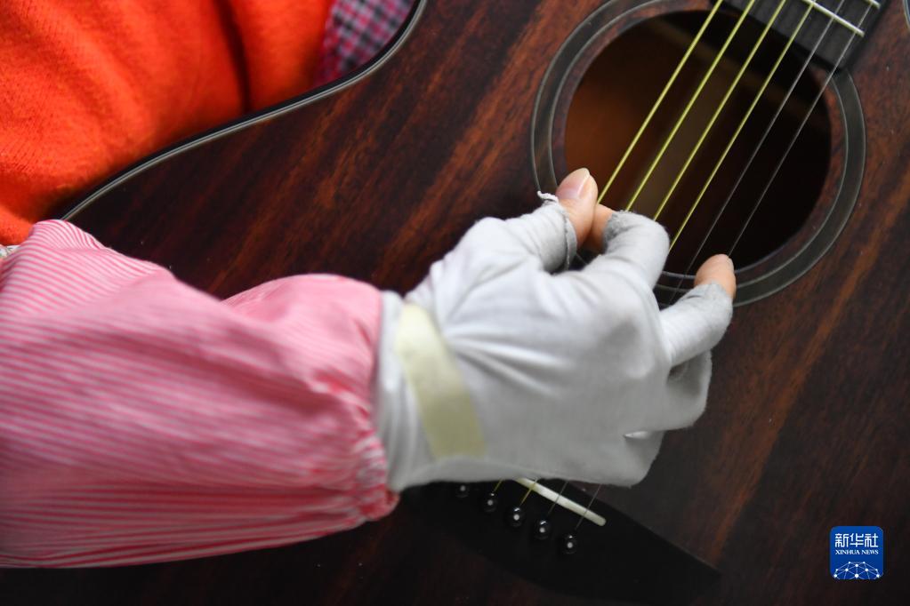 11月3日,在东安经济开发区一家吉他生产企业,工人在给吉他调音。