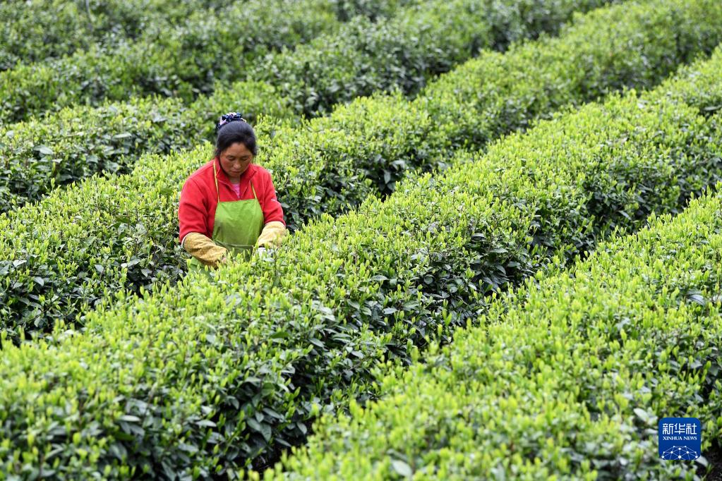 安徽金寨县花石乡大湾村的村民在茶产业扶贫基地里采茶(2020年4月17日摄)。新华社发