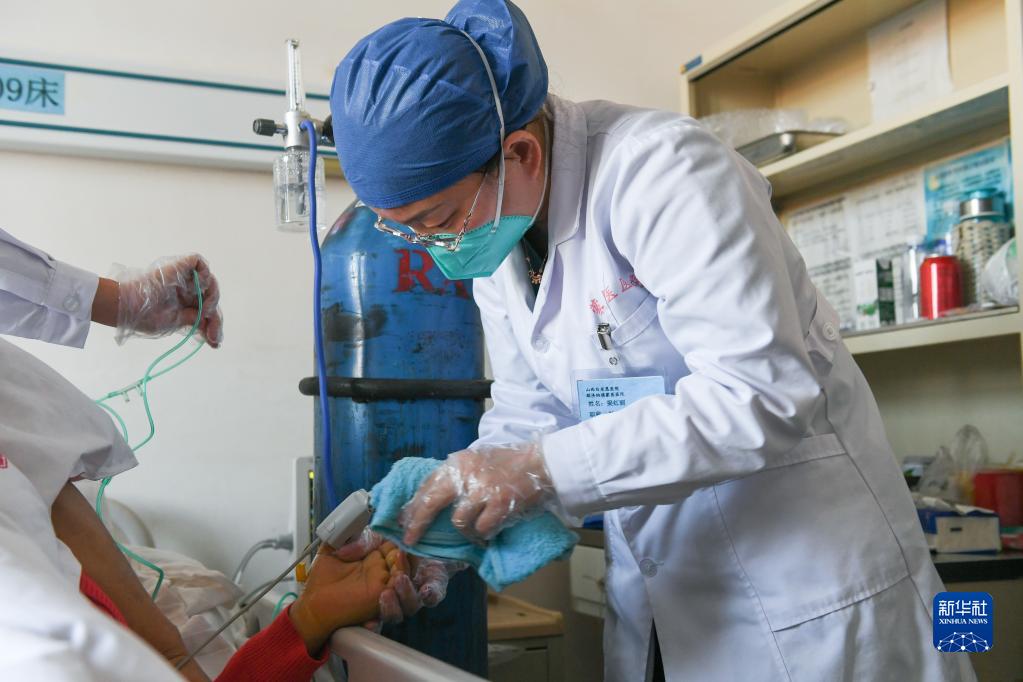 11月3日,国家紧急医学救援队山西队队员梁红丽在病房内为患者擦手。新华社记者 贝赫 摄