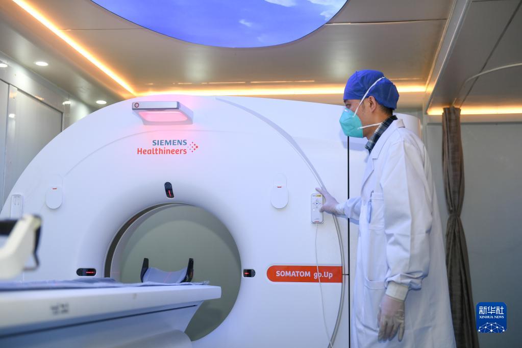 11月3日,国家紧急医学救援队山西队队员在移动CT方舱内调试设备。新华社记者 贝赫 摄
