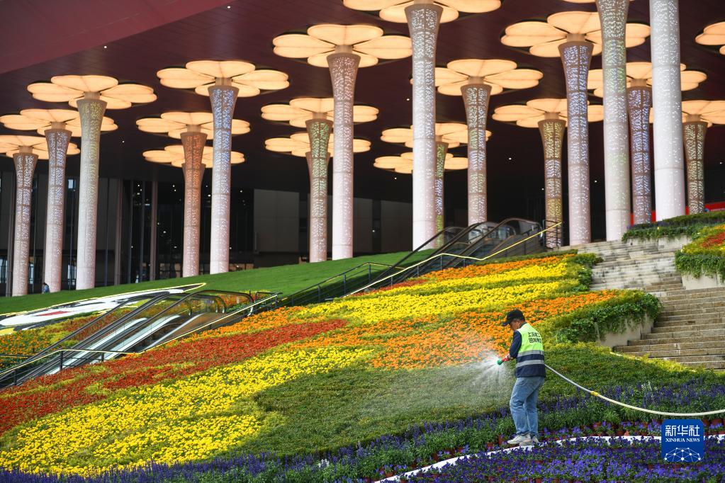 11月4日,工作人员在国家会展中心(上海)南广场给植物浇水。