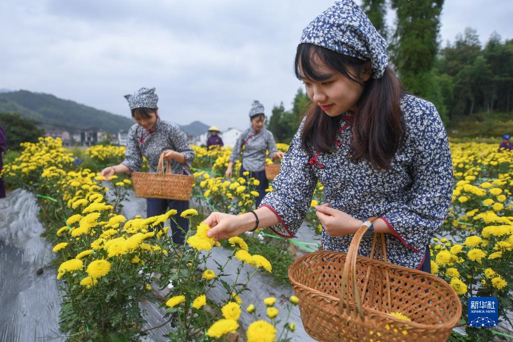 11月4日,在浙江省青田县阜山乡轩德皇菊基地,工作人员在采摘皇菊。