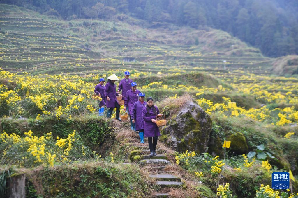 11月4日,在浙江省青田县阜山乡轩德皇菊基地,工作人员带着采摘好的皇菊下山。