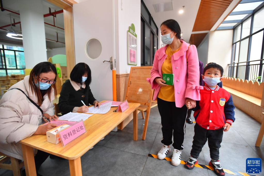 11月4日,在湖南省永州市零陵区安琪正央幼儿园,小朋友在家长的陪同下登记新冠疫苗接种信息。