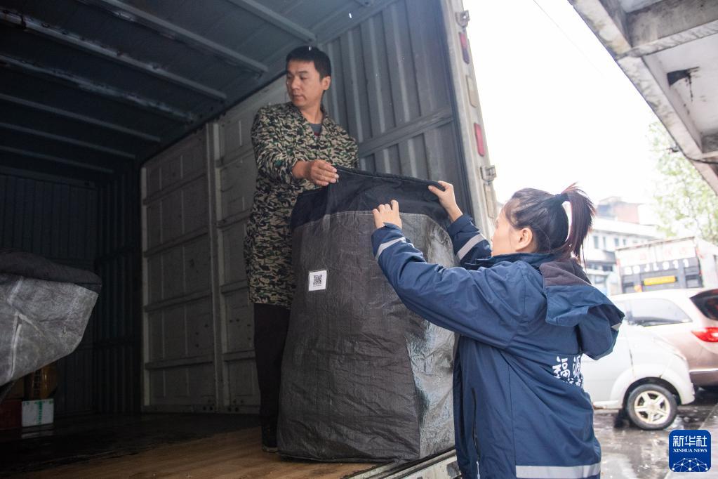 11月3日,在黄市镇新生快递乡村服务站,胡夏(右)从快递中转车上取出包裹。