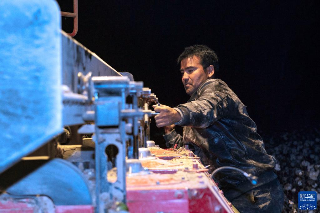 在新疆沙雅县托依堡勒迪镇的一处棉田里,艾买尔·艾则孜在调整采棉机机头间距,清理夹杂在里面的棉花枝叶,使采棉机恢复正常工作(10月25日摄)。