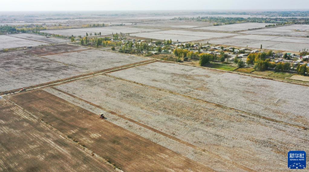 在新疆沙雅县托依堡勒迪镇的一处棉田里,艾买尔·艾则孜驾驶采棉机在为其他棉农采收棉花(10月24日摄,无人机照片)。