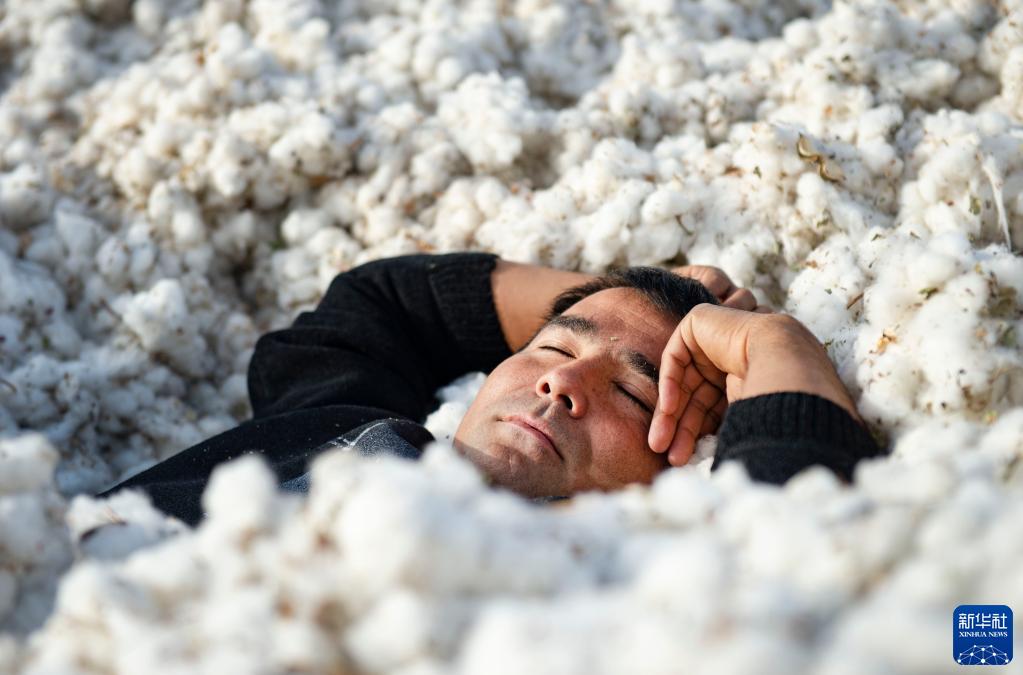在新疆沙雅县托依堡勒迪镇的一处棉田里,艾买尔·艾则孜躺在刚采下的棉堆里小睡(10月26日摄)。