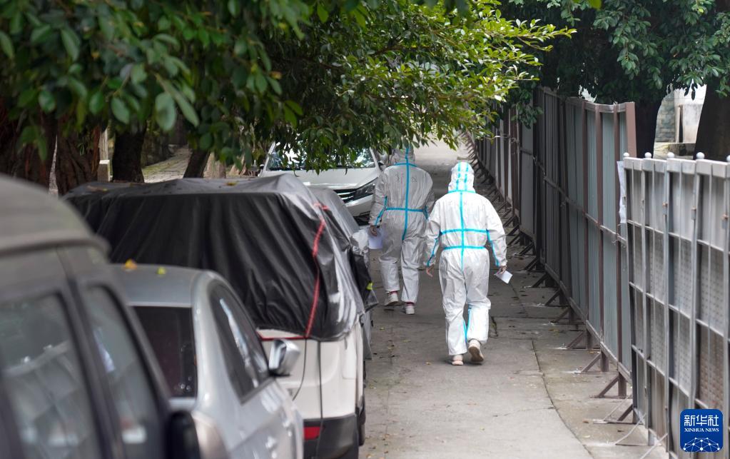 11月4日,在重庆九龙坡区九龙街道,两名身穿防护服的青年志愿者走向自己负责的楼栋。
