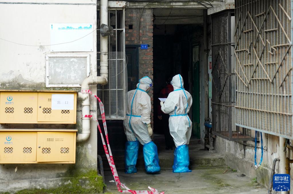 11月4日,在重庆九龙坡区九龙街道,两名身穿防护服的青年志愿者准备入户核对信息。