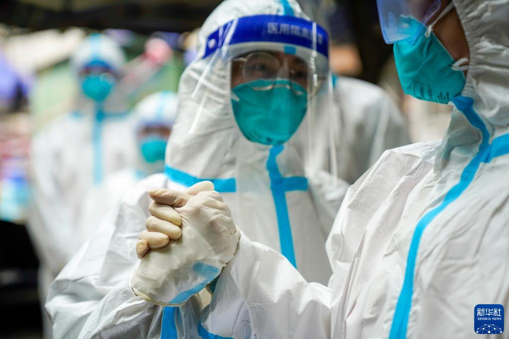 11月4日,在重庆九龙坡区九龙街道,两名青年志愿者握手预祝工作顺利。