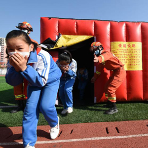 11月4日,河北省邯郸市涉县第二实验小学的学生们参与消防逃生体验活动。