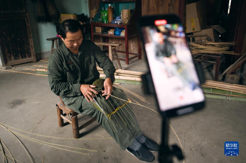 11月2日,在浙江省杭州市临安区锦南街道横岭村,潘云峰用手机录制竹编制品加工过程。