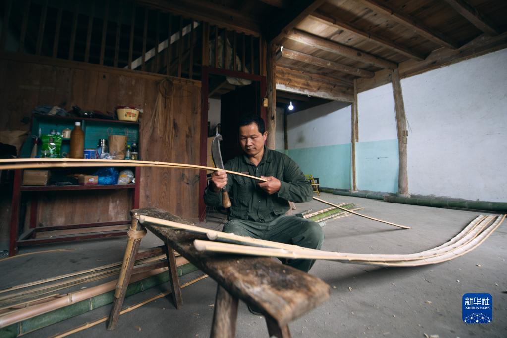 11月2日,在浙江省杭州市临安区锦南街道横岭村,潘云峰用竹刀将竹子削成可供编织的竹篾。