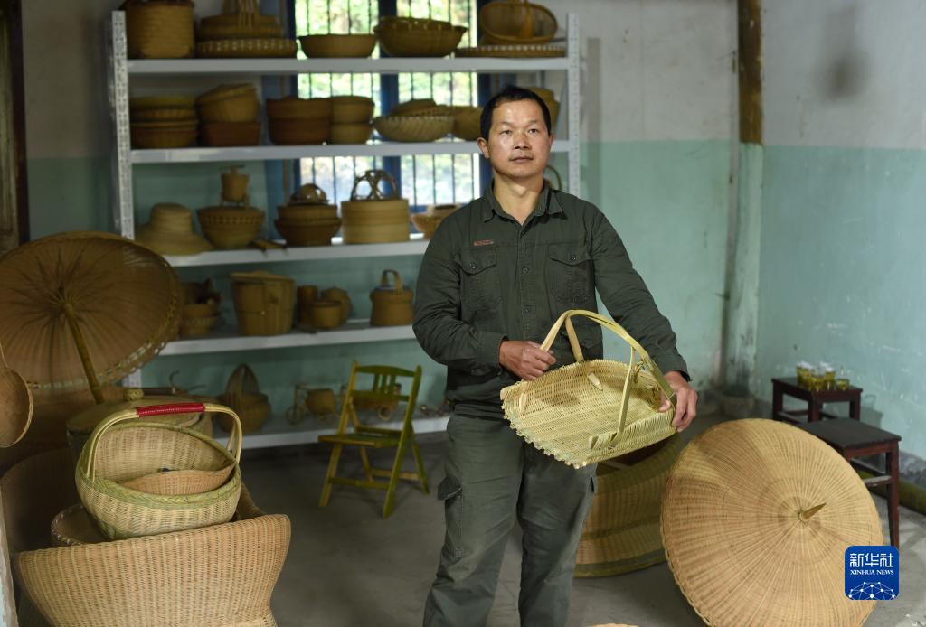 11月2日,在浙江省杭州市临安区锦南街道横岭村,潘云峰展示自己加工的竹编制品。