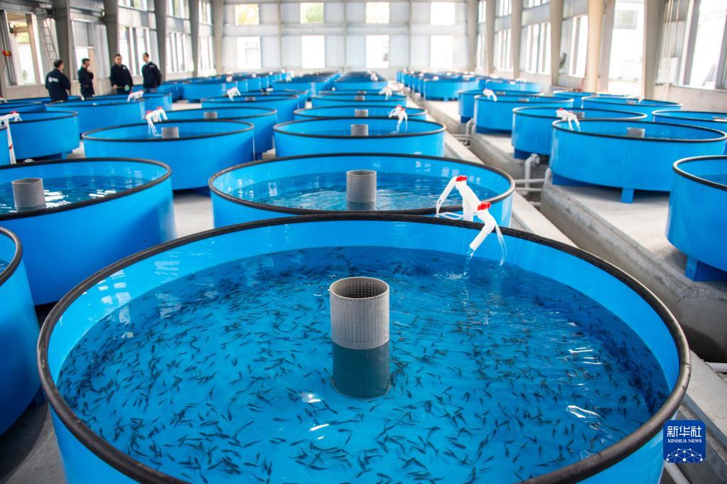 11月2日,中华鲟研究所科研人员在幼苗培育车间巡视。