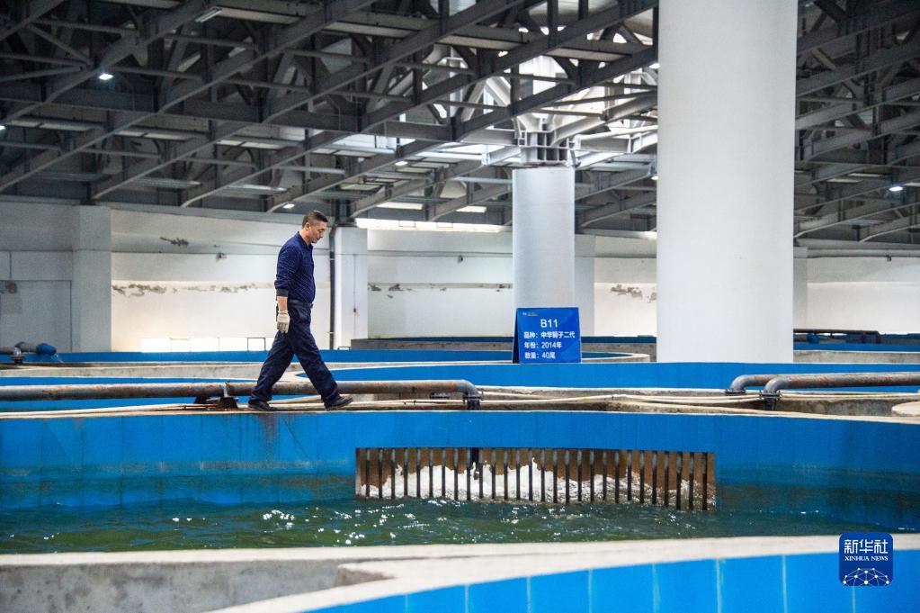 11月2日,中华鲟研究所科研人员在巡视中华鲟生长状态。