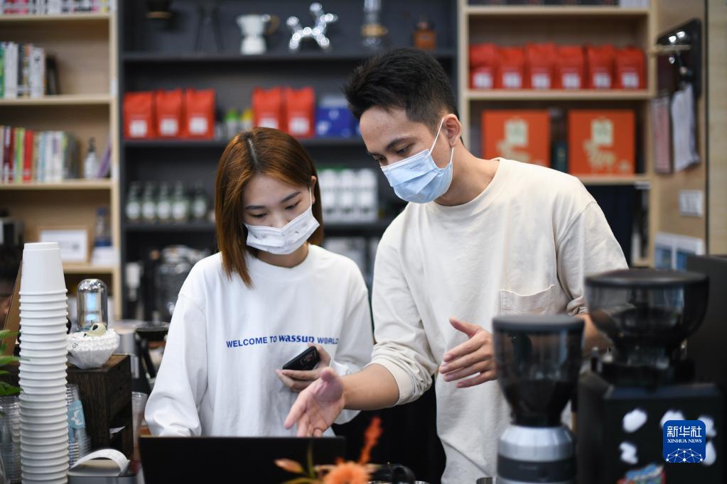在一场活动开始前,唐震声(右)跟店员交代注意事项(10月30日摄)。
