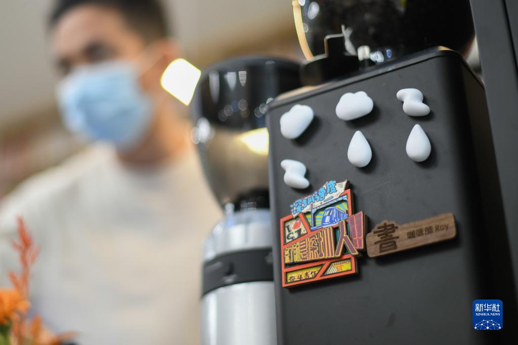 唐震声在店里帮客人点单。他的咖啡机上贴着“来了就是深圳人”“咖啡师ROY(他的英文名)”等标签(10月30日摄)。