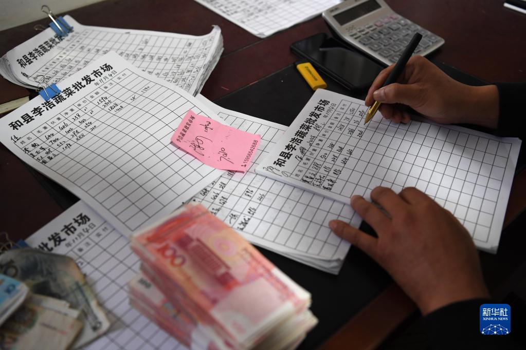 11月4日,在安徽省马鞍山市和县历阳镇太平村由中间商设在村里的蔬菜市场中,工作人员在登记菜农销售的辣椒数额。