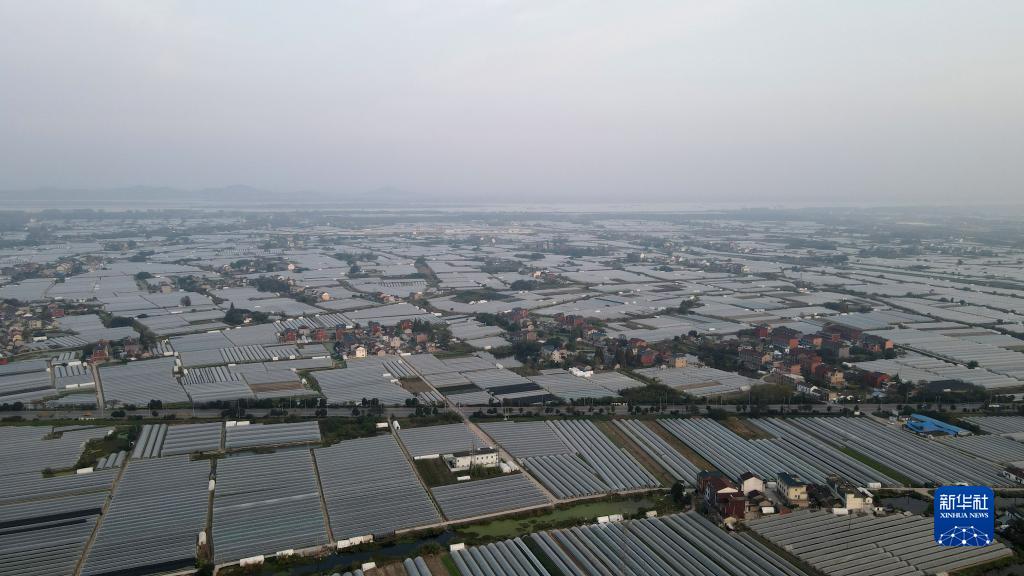这是11月3日在安徽省马鞍山市和县拍摄的蔬菜大棚和村庄(无人机照片)。