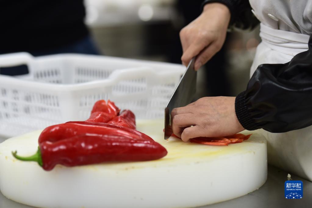 11月5日,合肥市一家食堂的工作人员在切辣椒。
