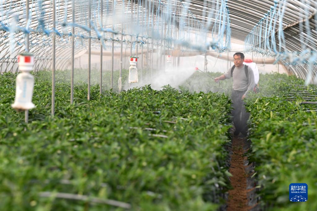 11月3日,安徽省马鞍山市和县历阳镇太平村村民在辣椒蔬菜大棚里进行田间管理。