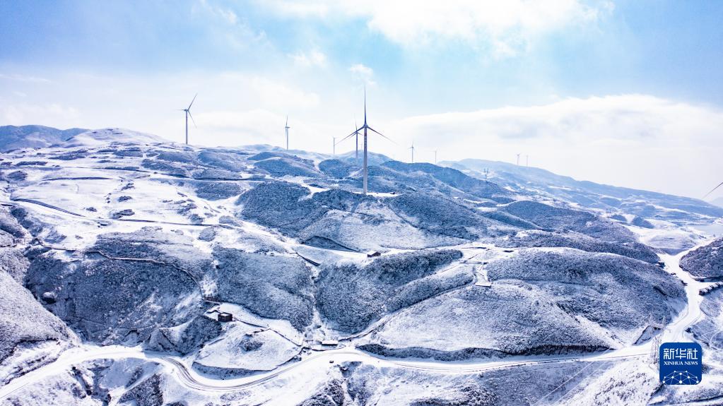 雪后的六盘水市盘州四格风电场(1月12日摄,无人机照片)。