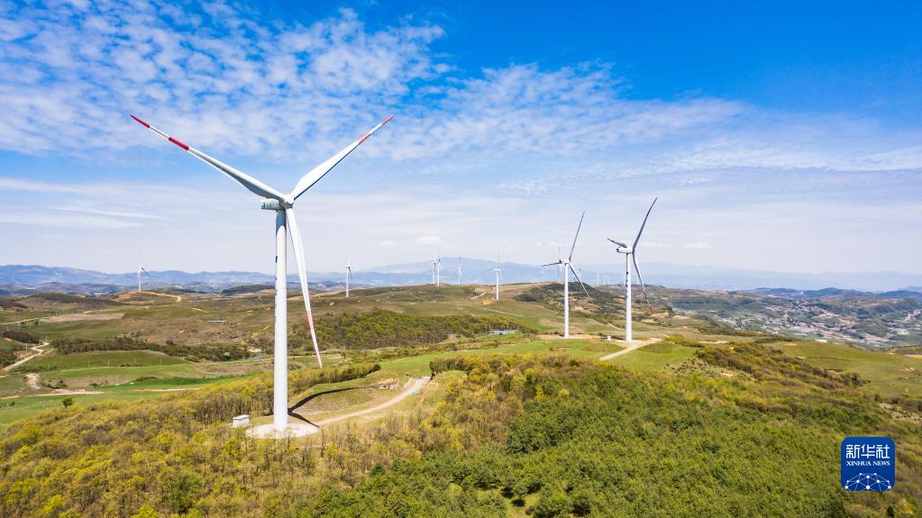 贵州省威宁彝族回族苗族自治县雪山镇的风力发电设备(2020年4月27日摄,无人机照片)。