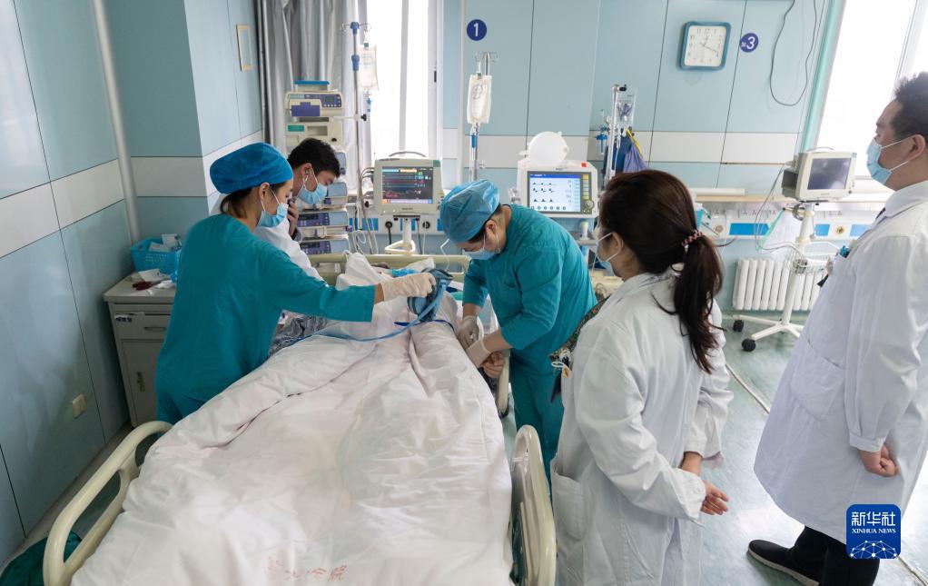 11月5日,在北京市第六医院的医联体胸外科ICU病房,北京协和医院与北京市第六医院的医护人员在开展荧光腔镜精准肺段手术后查看患者的术后情况。