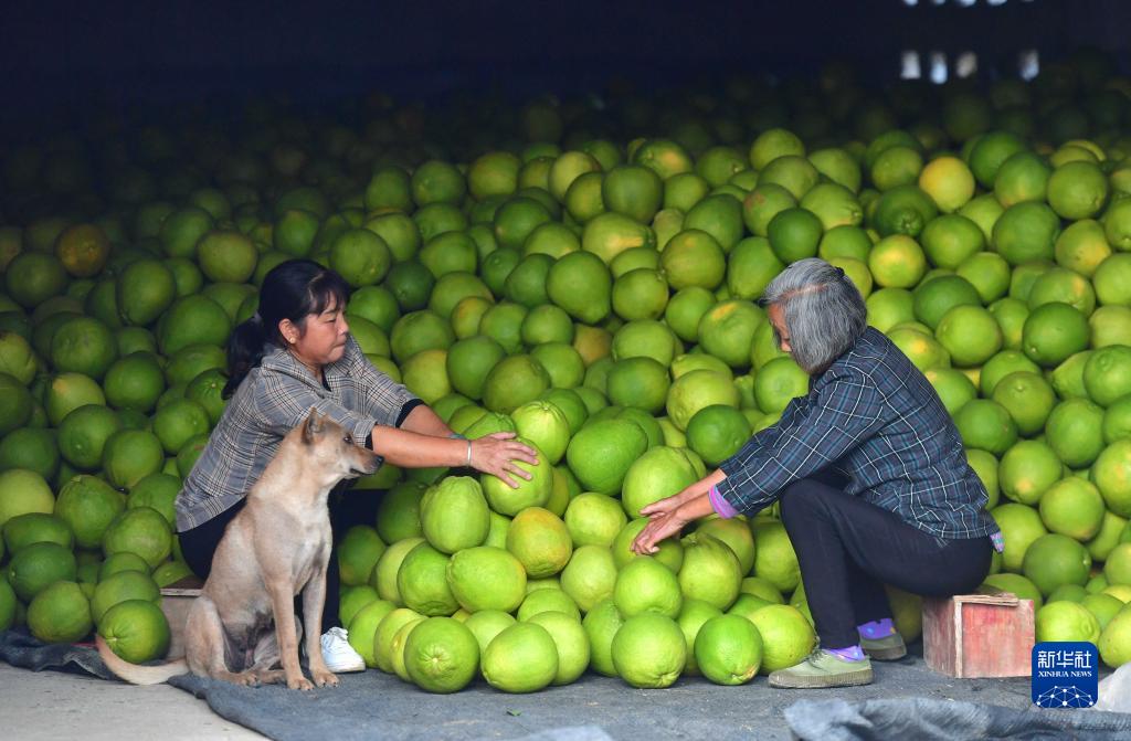 11月5日,在广西融水苗族自治县永乐镇兴隆村,村民在挑选糯米柚准备发货。