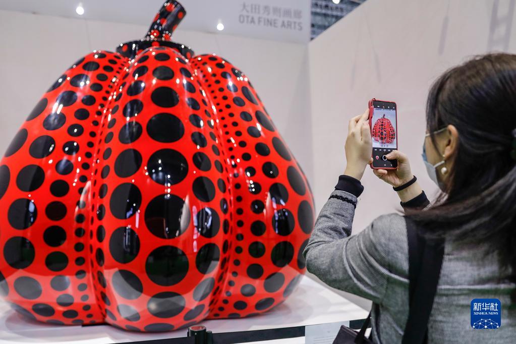 当日,日本艺术家草间弥生2019年创作的作品《南瓜》亮相第四届中国国际进口博览会服务贸易展区。