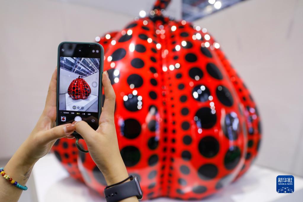 11月5日,观众在展馆内拍摄日本艺术家草间弥生的作品《南瓜》。