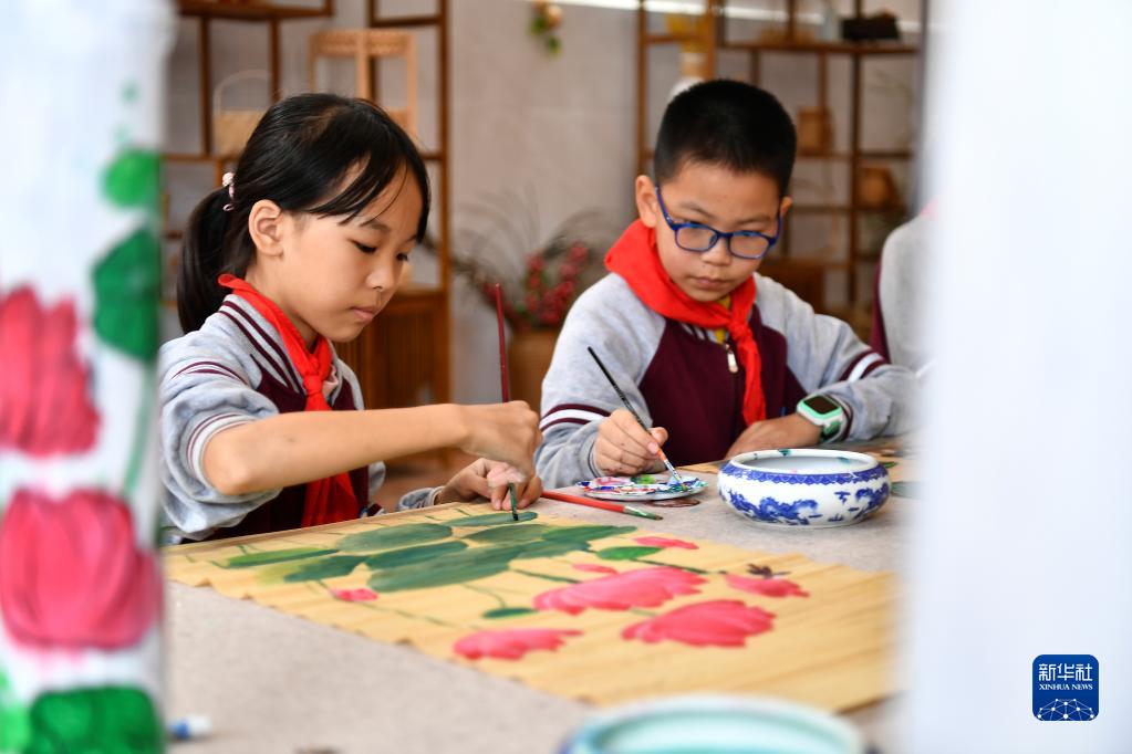 11月5日,四川省广安市富源小学学生在竹丝帘上绘画。