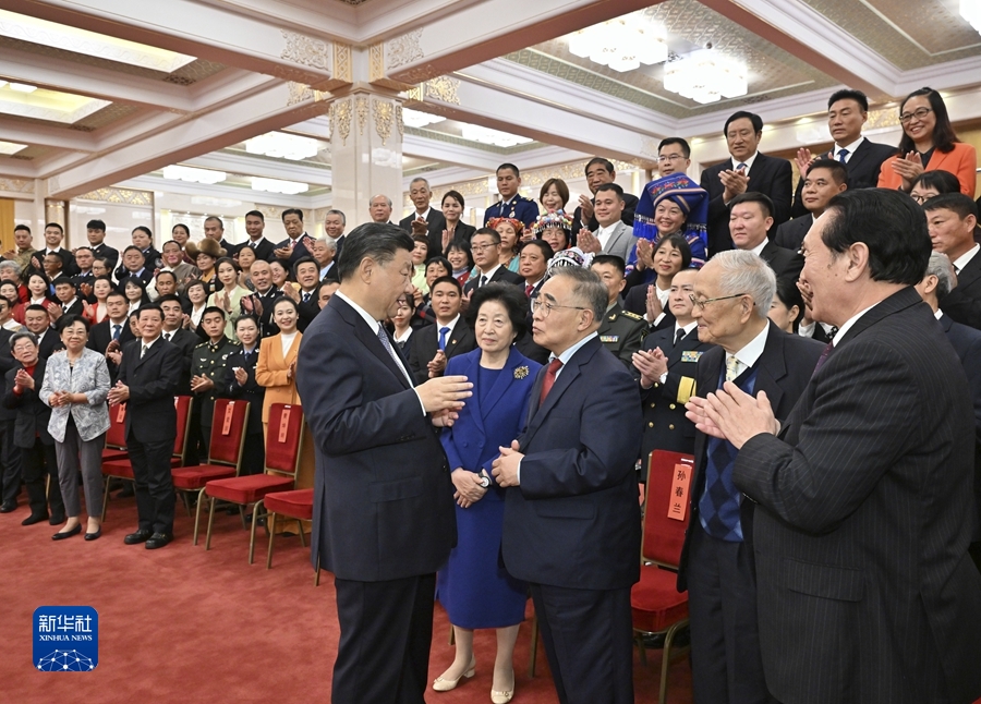 11月5日,党和国家领导人习近平、王沪宁等在北京人民大会堂会见第八届全国道德模范及提名奖获得者。这是习近平同全国敬业奉献模范张伯礼等亲切交流。新华社记者 李学仁 摄