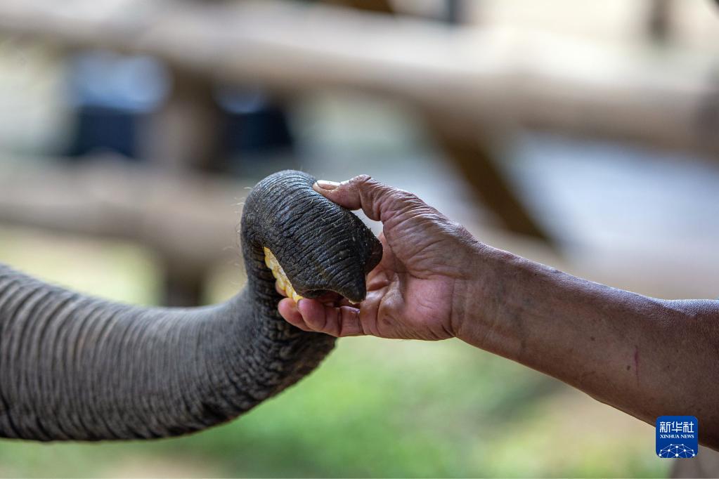 10月27日,工作人员在泰国南邦府的大象保护中心给大象喂食。