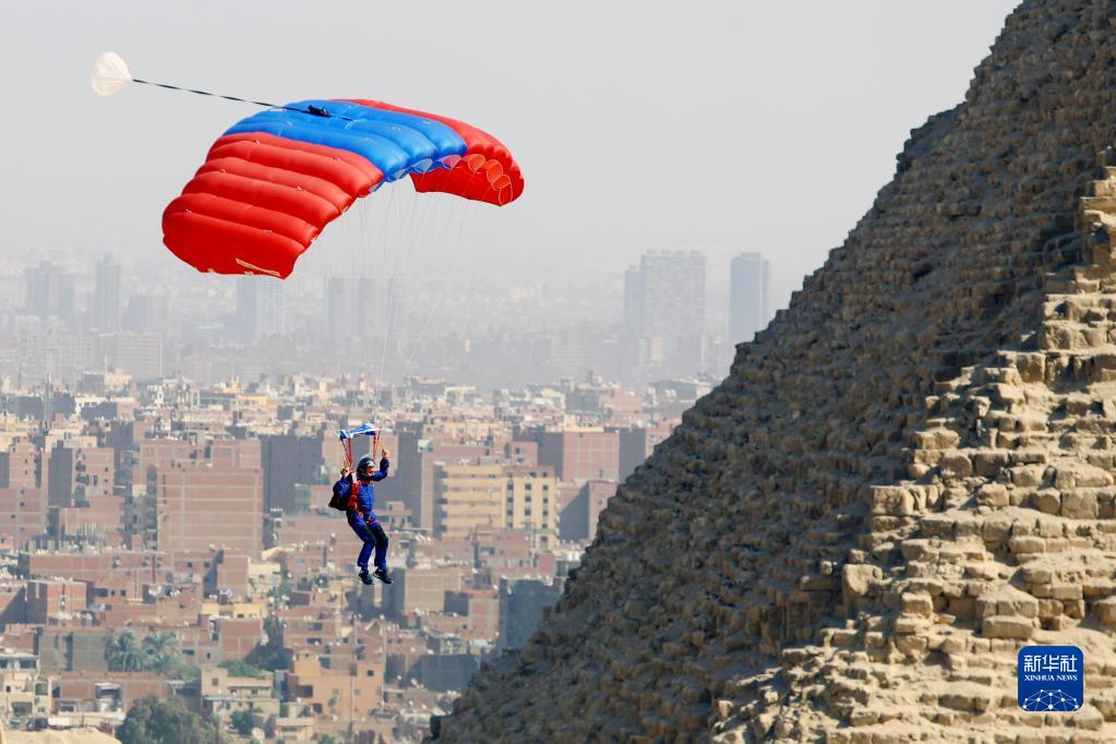 11月1日,在埃及吉萨金字塔景区,运动员进行跳伞表演。