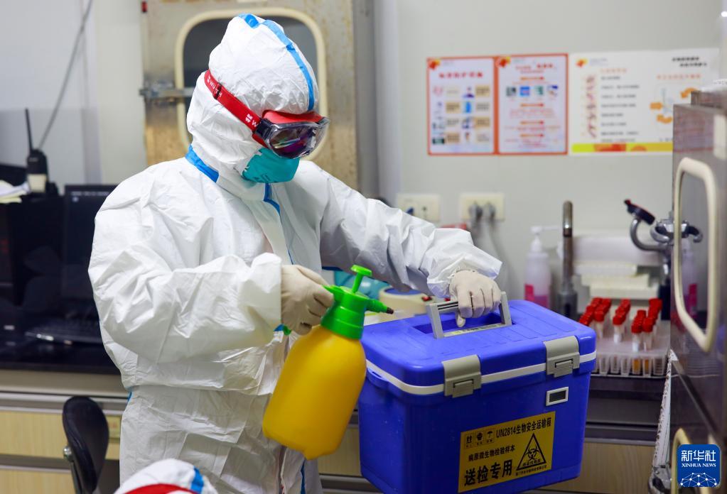 11月6日凌晨,重庆市九龙坡区人民医院核酸检测实验室内,张名均在对转运核酸检测样本的专用箱进行消毒。