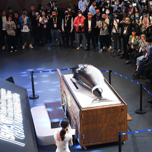 当日,一条体长近3米、重达353公斤的“金枪鱼王”亮相第四届进博会食品及农产品展区。据悉,这条在地中海海域生长的蓝鳍金枪鱼由光明食品集团旗下上海水产集团采购,经冷链运输于10月31日运抵上海。
