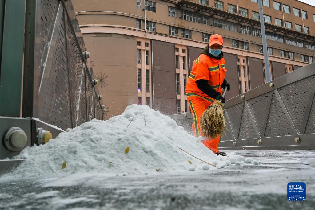 11月6日,呼和浩特市环卫工人在清理积雪。