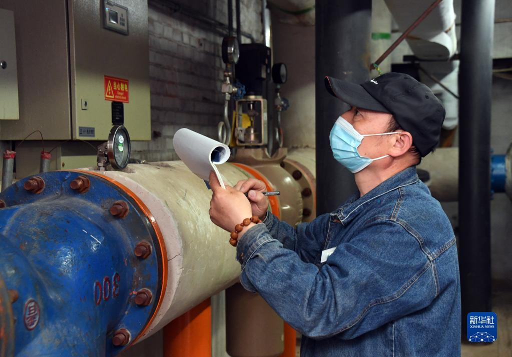11月6日,在北京交通大学供暖交换站,工作人员查看供暖设备运行情况。